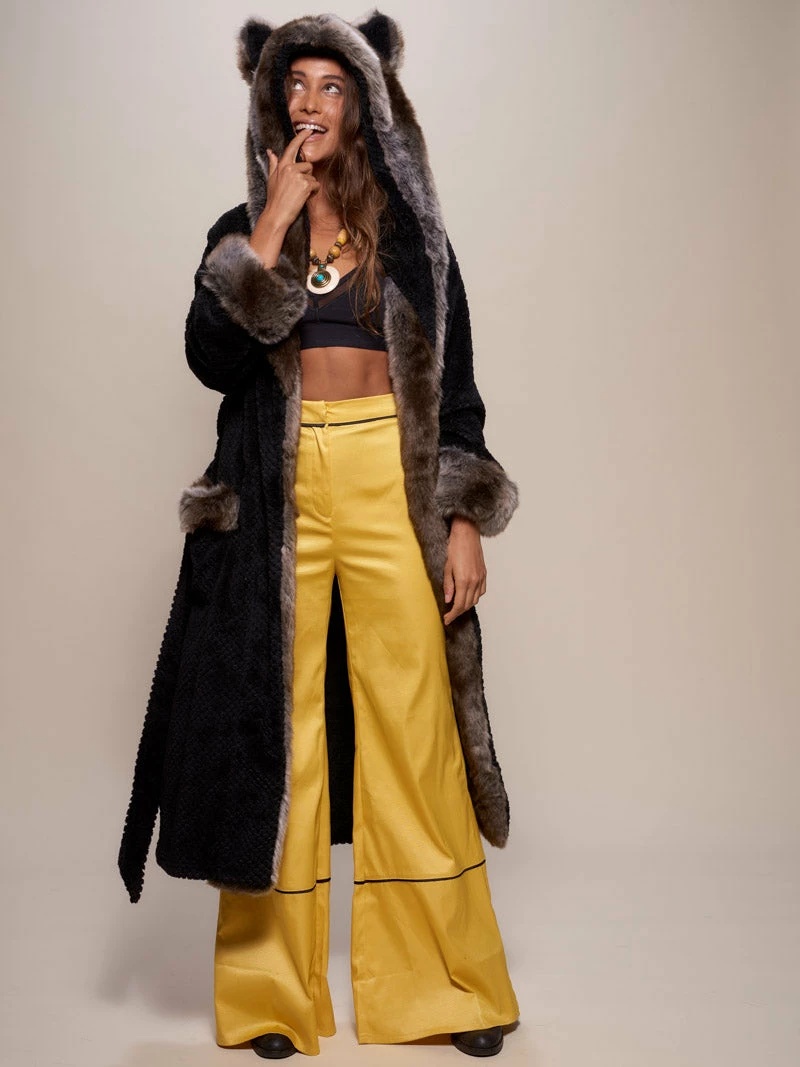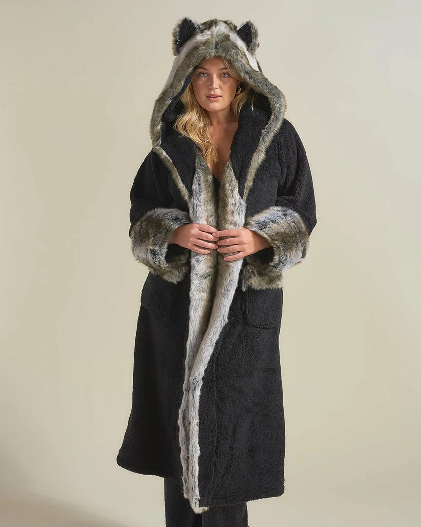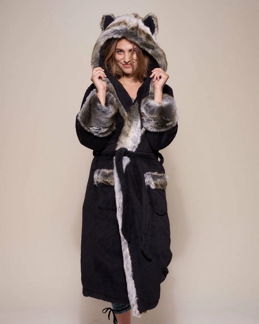 Grab your cozy faux fur robe for women featuring a Grey Wolf design today and slip into luxurious warmth.