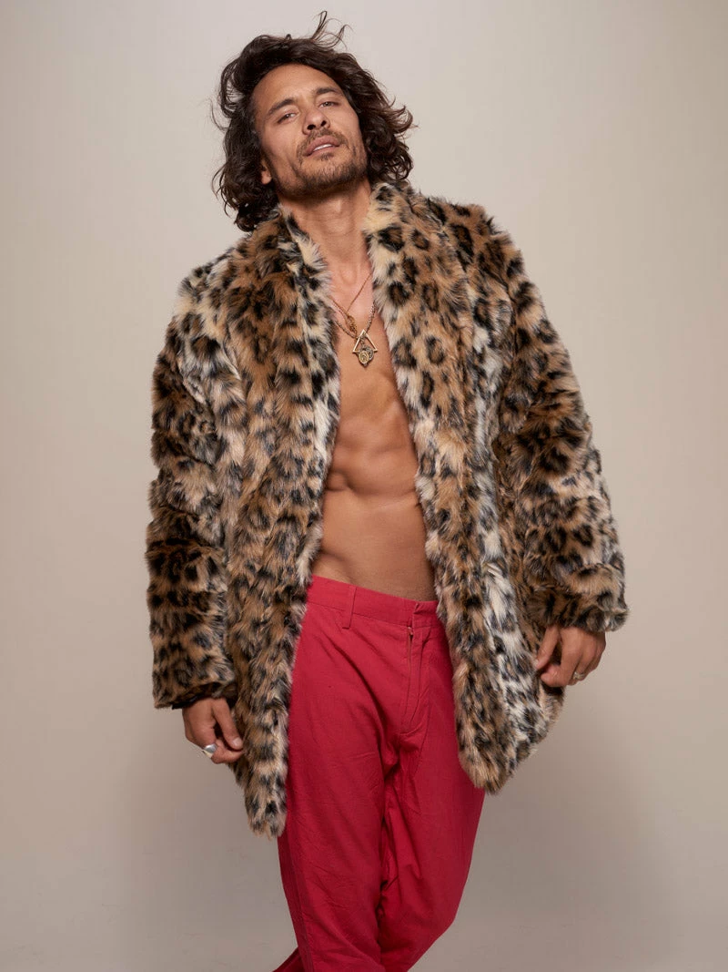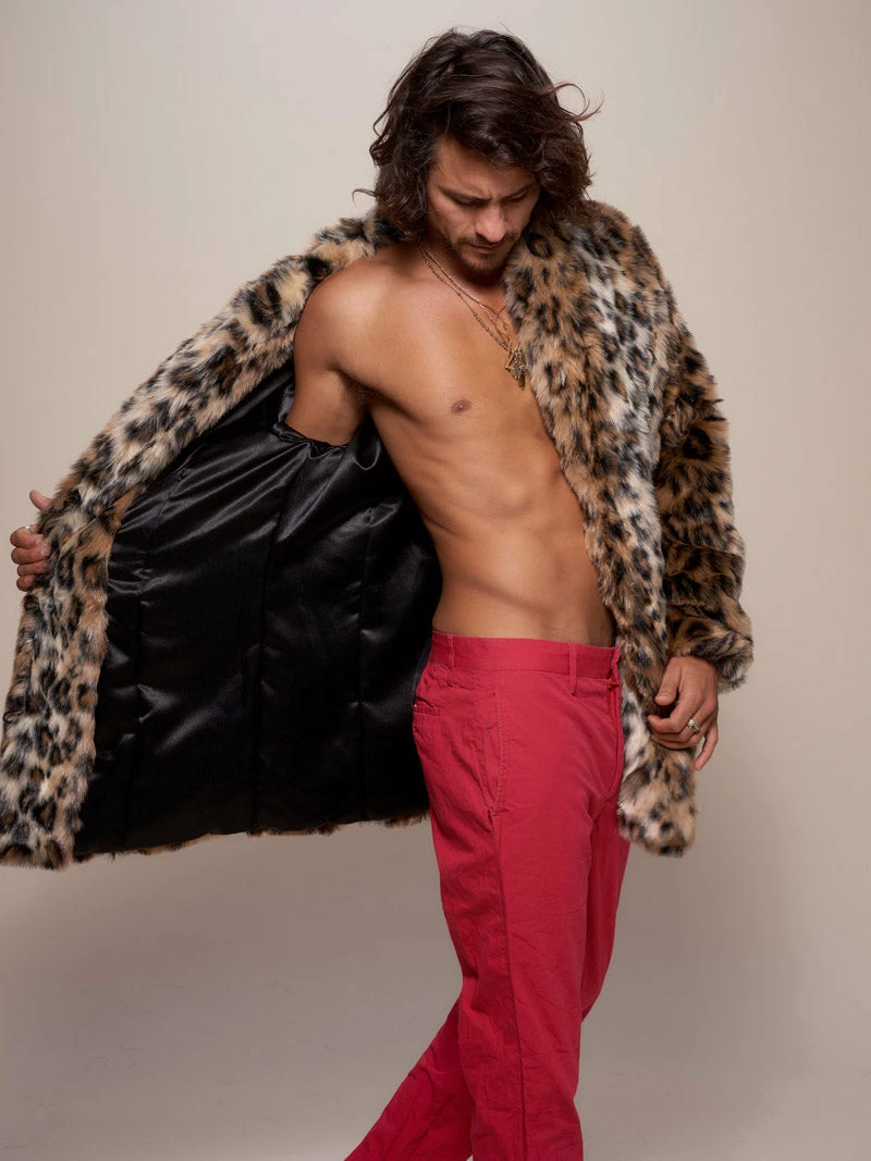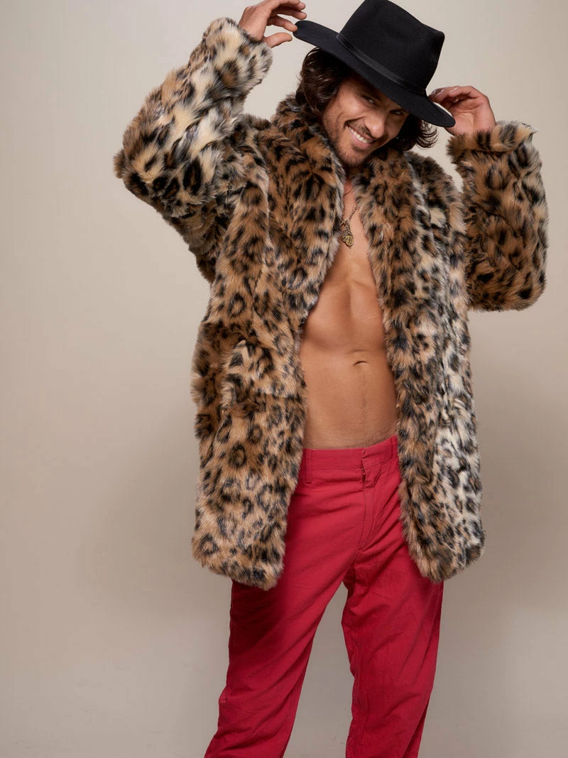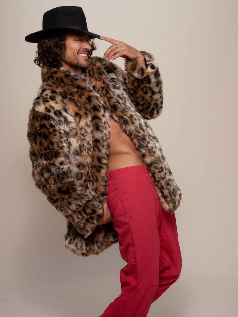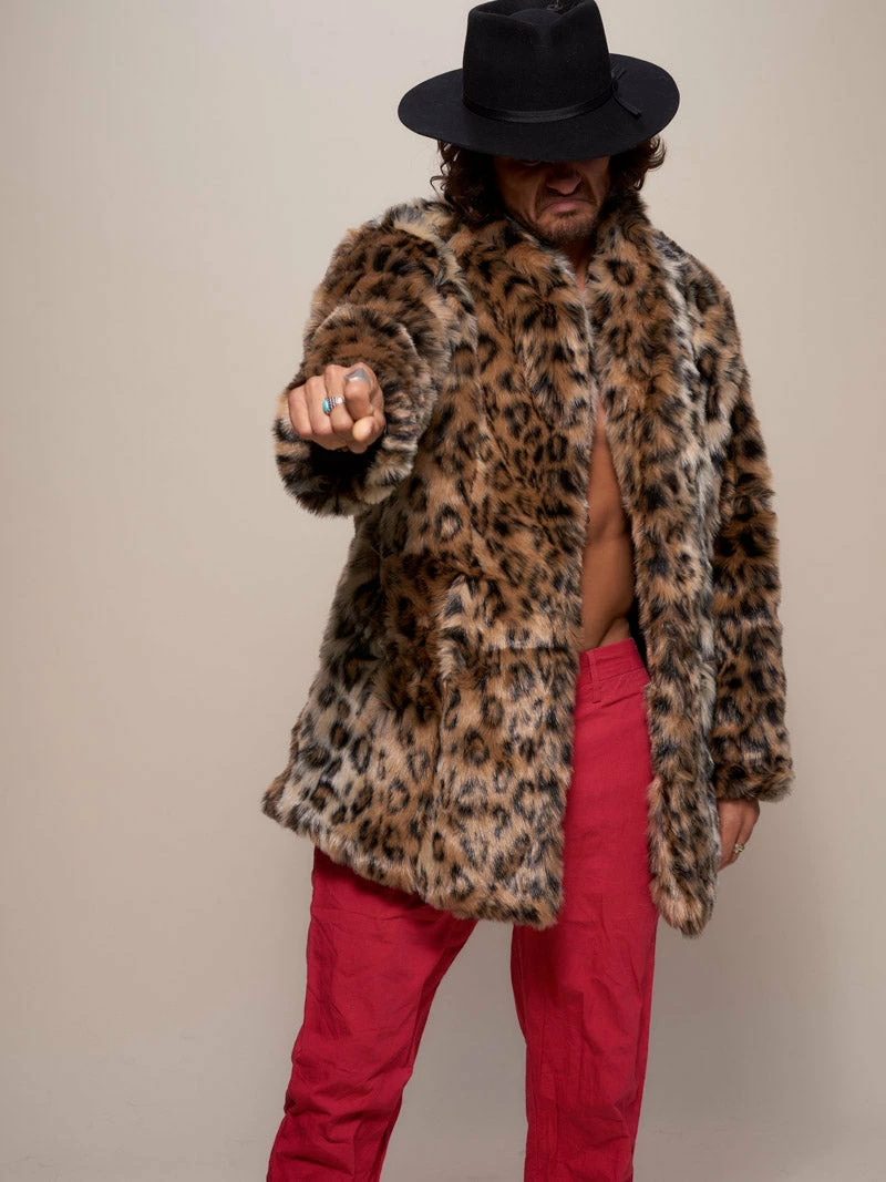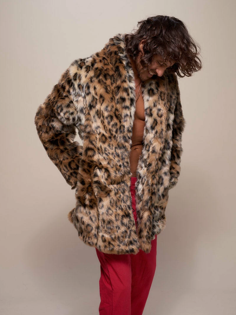 Slip into luxury with a men’s hoodless Collared Leopard Faux Fur Coat today.